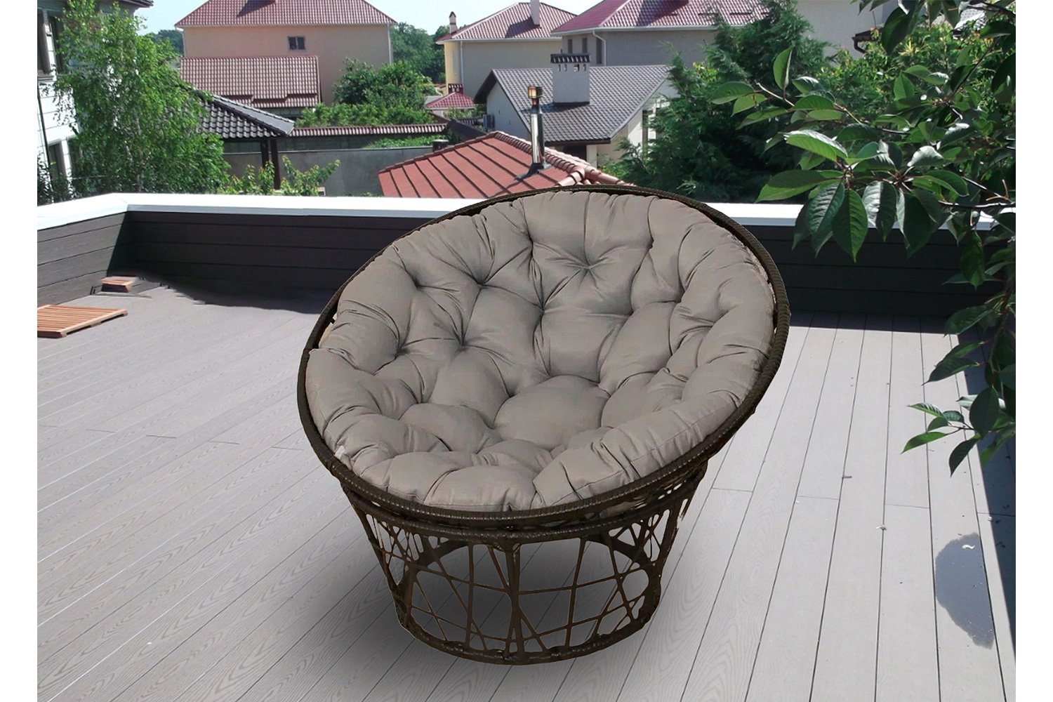 Преимущество кресла заключаются в материалах, из которых оно сделано. Каркас выполнен из стали, а оплетка и декор из искусственного ротанга темно-коричневого цвета. Искусственный ротанг не портиться от влаги, не теряет цвет на солнце, и в целом выдерживает большие нагрузки – конкретно эта модель рассчитана на нагрузку до 150 кг.