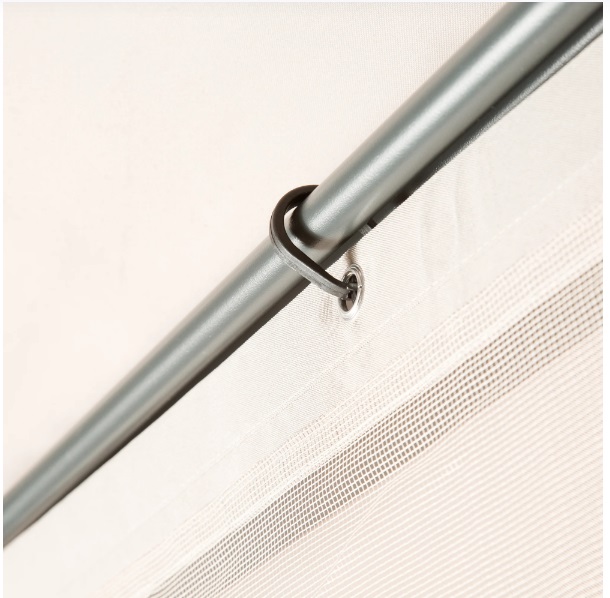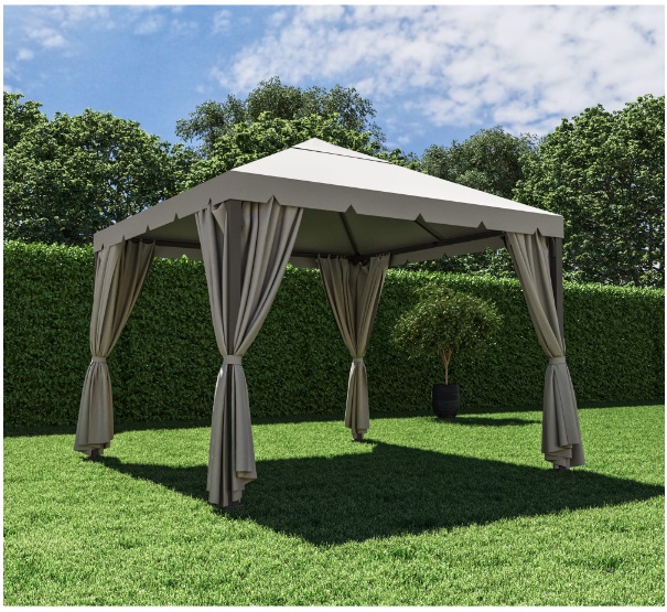 Размеры павильона в смонтированном виде — 299 × 282 × 299 см. Покрытие шатра — полиэстер, ткань имеет УФ-защиту. Набор прост в сборке и эксплуатации, по окончании летнего сезона легко разбирается.