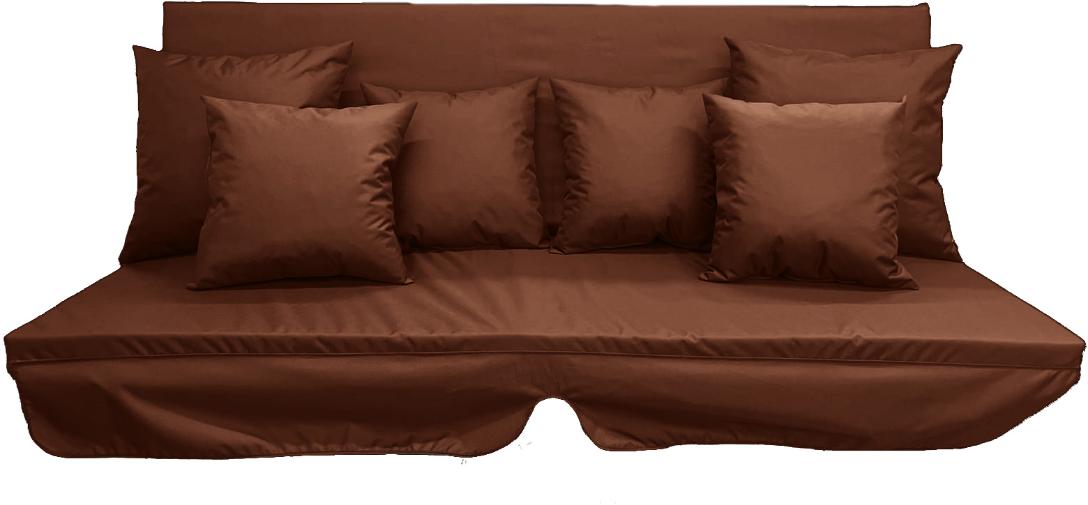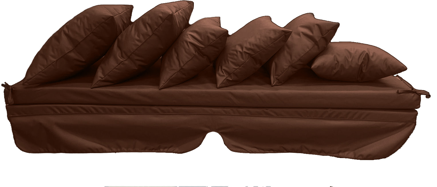 6- высота стенок 190-смВ данный комплект входят подушки, а также тент для качелей-беседки. Изготовлен данный комплект из полиэфирного волокна, а в качестве наполнителя для подушек используется холкон. Цвет у данного комплекта коричневый. В комплекте находится один матрас, размер которого составляет 190х8х120 см, четыре декоративных подушки 40 на 40 см, две декоративные подушки 50 на 50 см, один тент, а также москитная сетка.