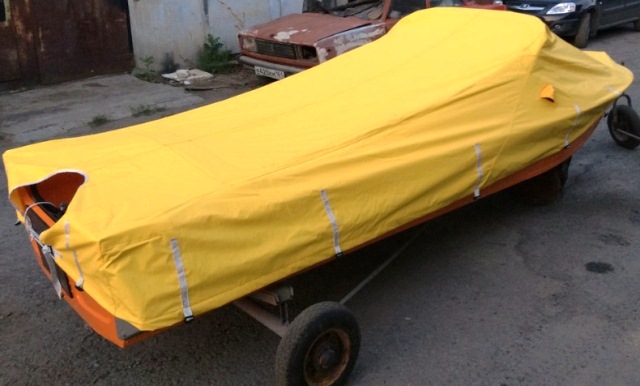 Тент для лодки крепится капроновым шнуром диаметром 5 мм, который вшит по периметру тента. Это позволяет плотно прижать тент к орту лодки, защищая ее от влаги и солнца. Дополнительно к тенту пришиты капроновые стропы длиной 20 см и шириной 25 мм, которые обеспечивают надежное крепление и усиленную защиту на выступающих местах. Концы строп можно затянуть через пряжку и крепить к раме прицепа или проводить под лодкой от пряжки до пряжки, образуя динную.